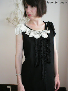So when I came upon this black sleeveless linen dress - I knew exactly what I would do. The only major alteration I did was to shorten it - it originally was to the floor. I really enjoyed placing the black linen ruffles and vintage lace on the dress, creating this lovely abstract creation.